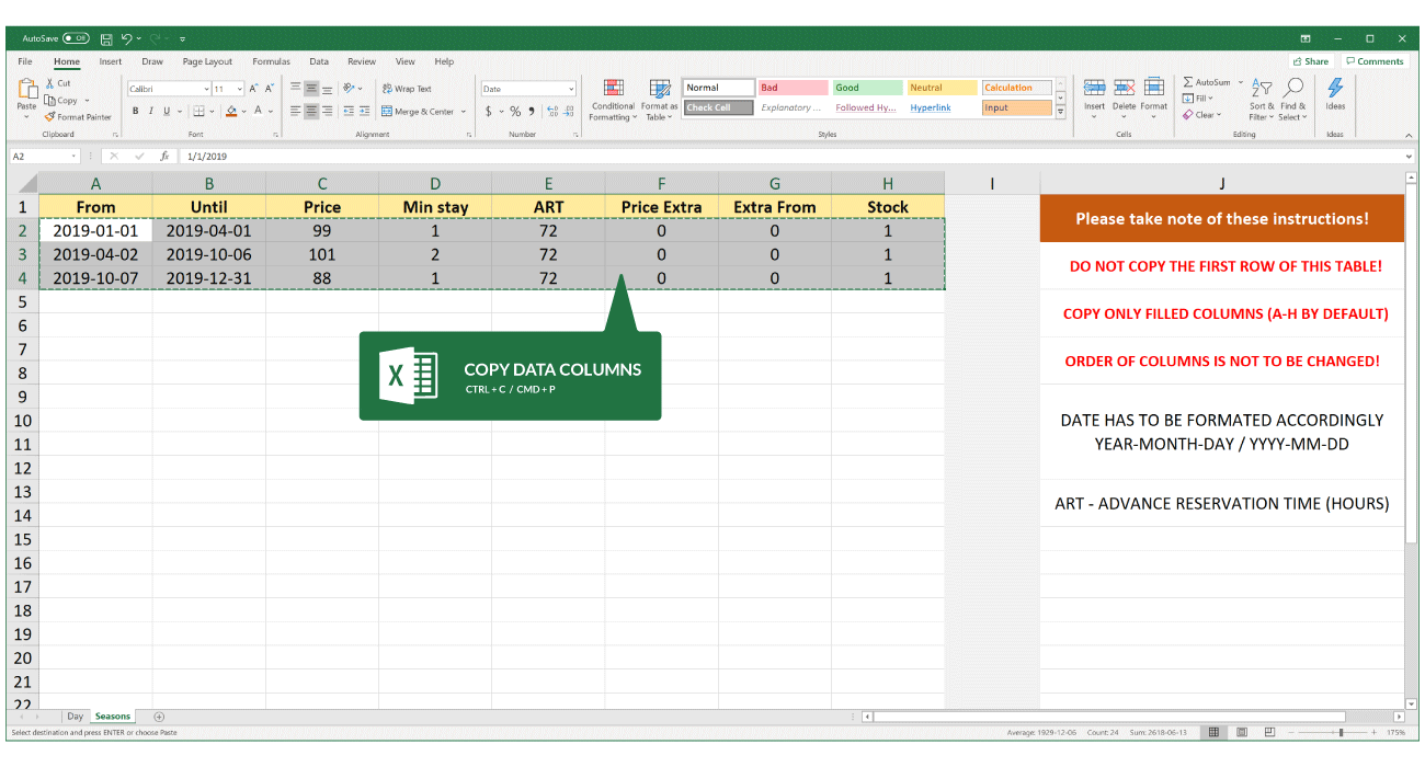 Daily or seasonal pricing it doesn't matter, just make sure your sheet follows the default structure displayed below. Import function can handle import from any worksheet software, but as it is the most popular and most requested one we will keep this tutorial focused on Excel.