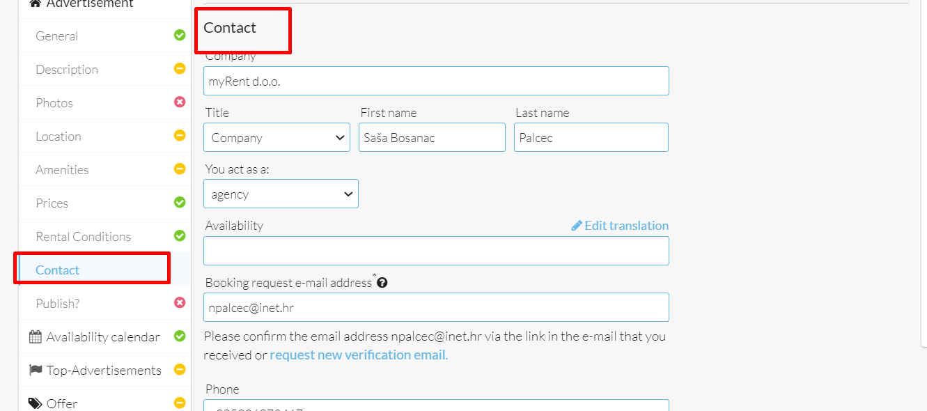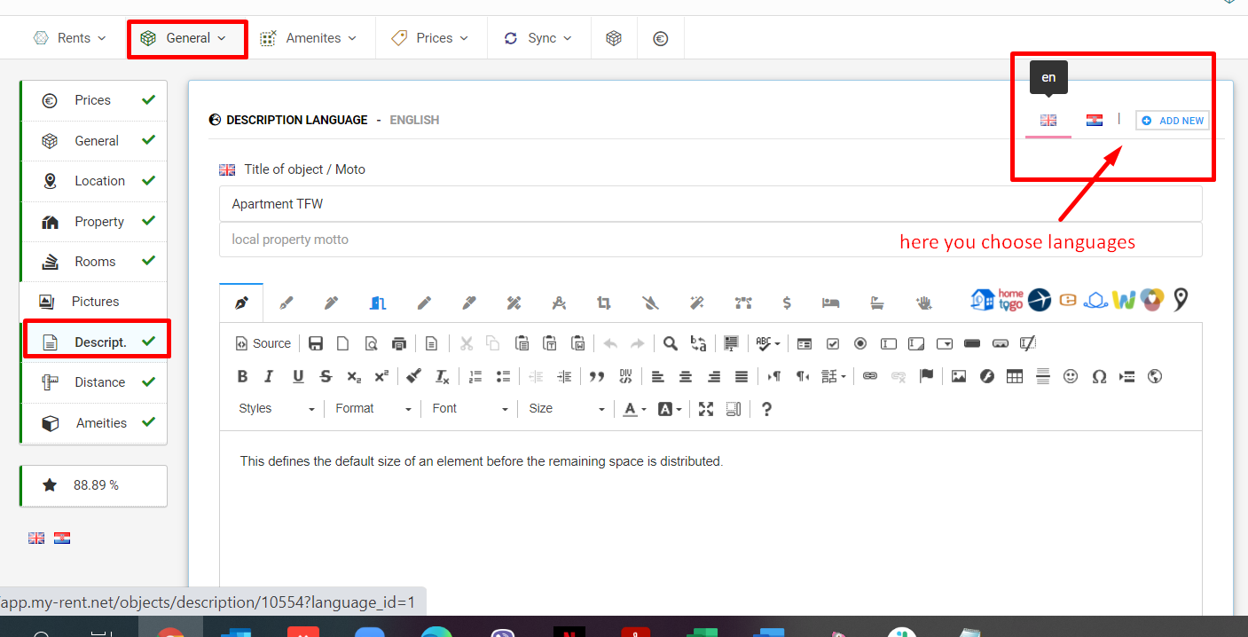 To add Contact/Languages you add it in myRent under property details-general-description-ADD LANGUAGE