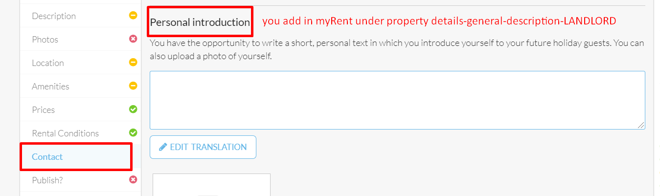 To add Contact/Personal introduction you add in myRent under property details-general-description-LANDLORD