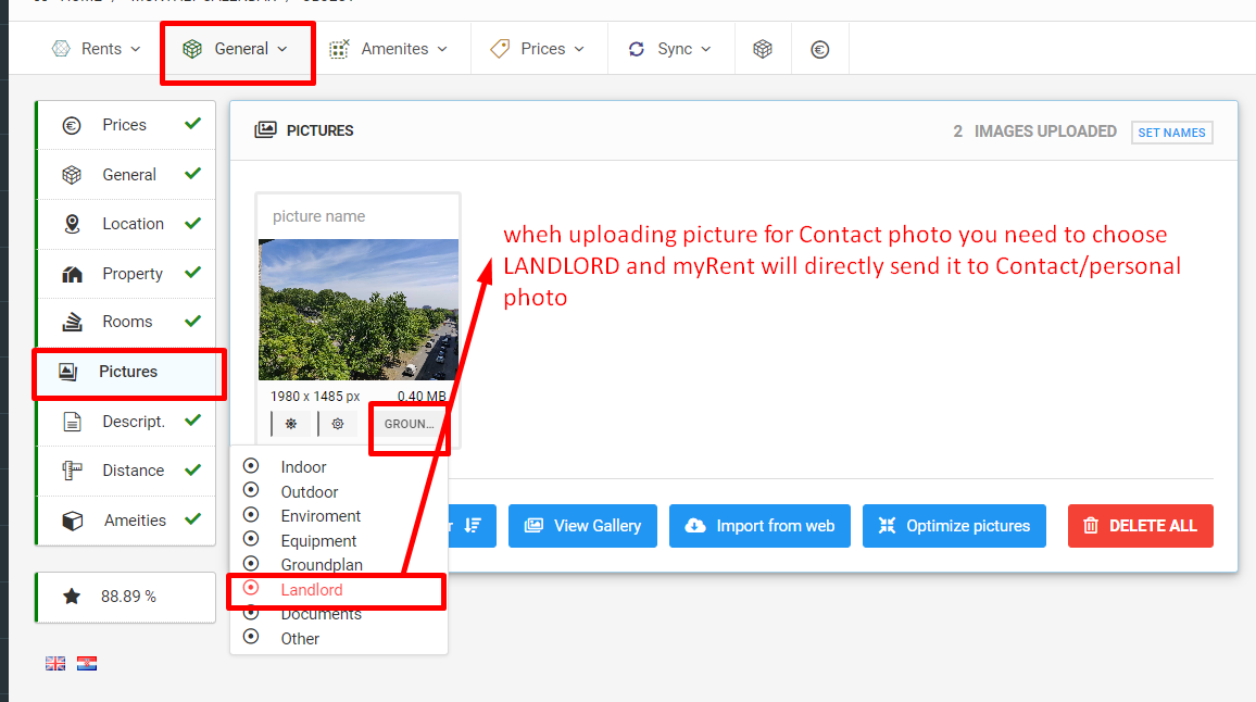 In myRent under property details-general-PICTURES. You need to choose LANDLORD.